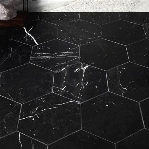 This hexagon tile features marbleized striations of gray and white on a black background that captures the timeless elegance of Nero Marquina.