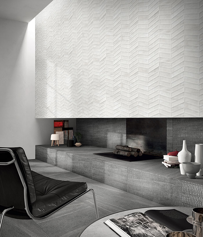 Painting porcelain tile collection offers designs that are inspired by the natural different in tones of the concrete floor. The collection features three different shades of grey, along with matching patterned tiles for accent walls.