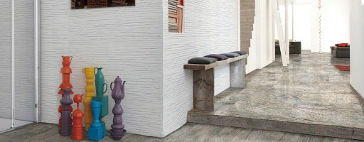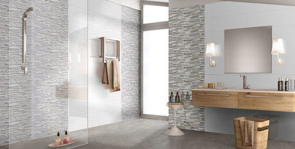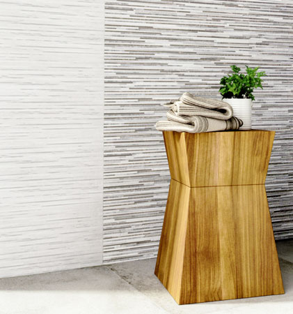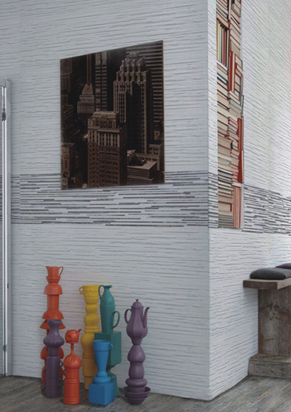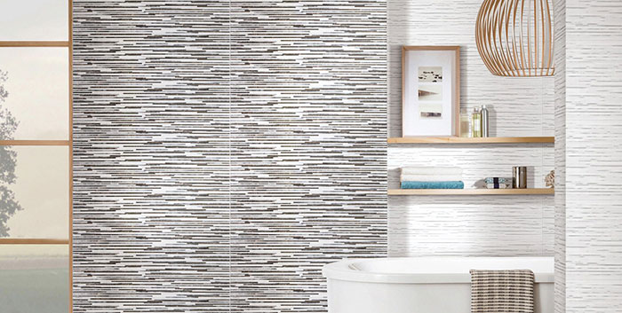 Wall tile collection WR93 showcases linear strips of marble motifs with complementary tones. Suitable for bathroom and/or kitchen wall application.